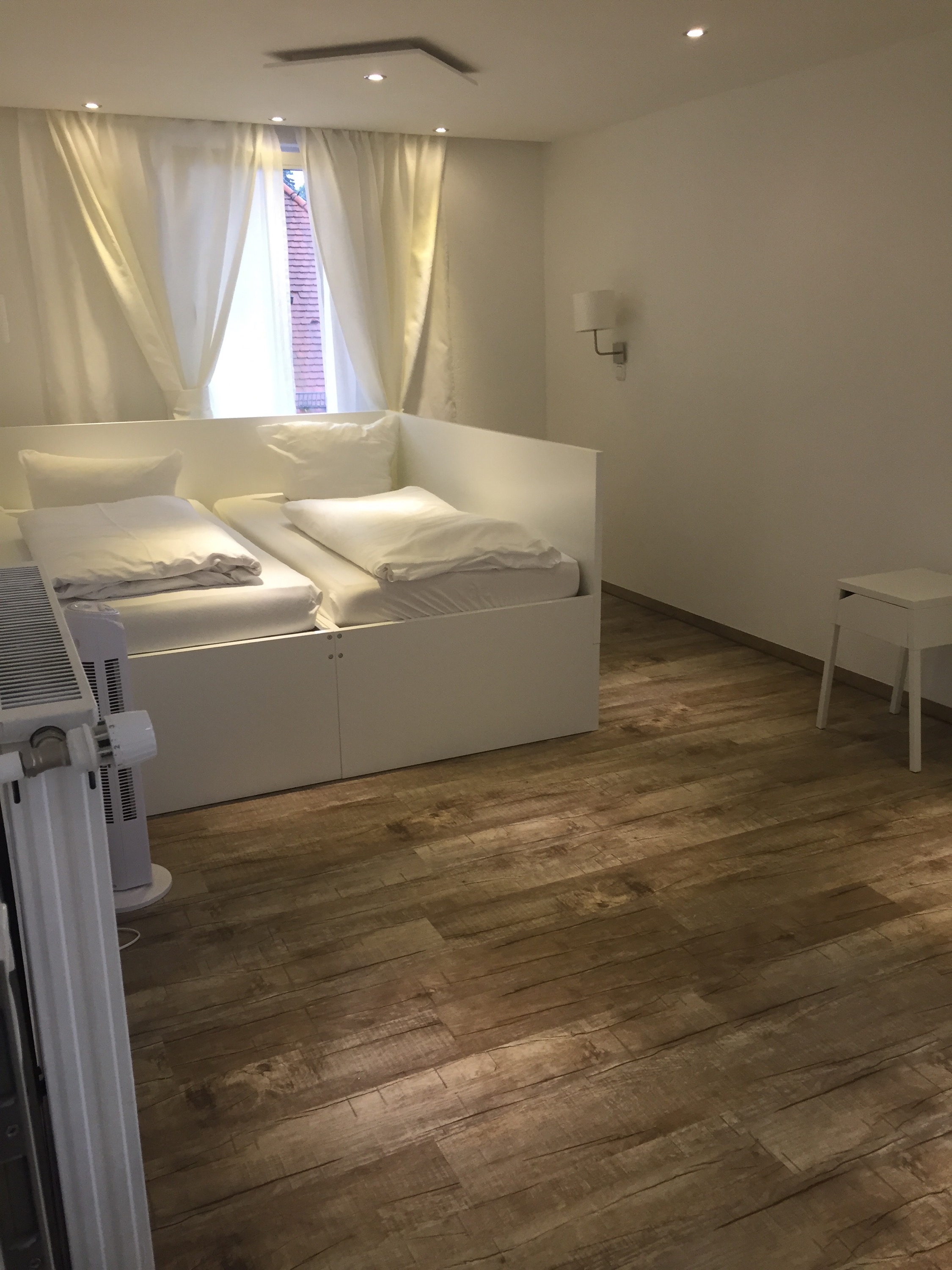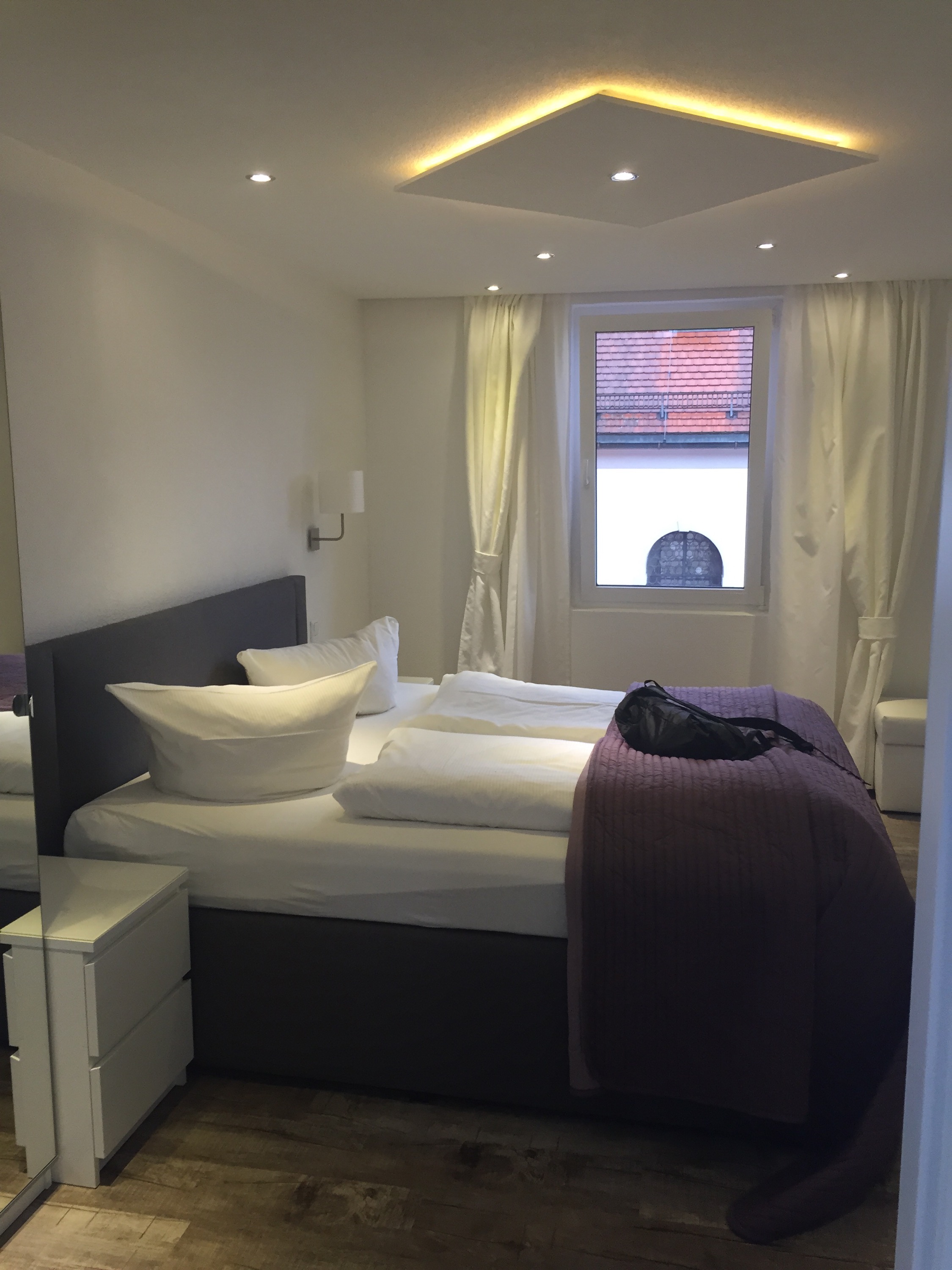 The rain found us as we wound through Germany and into the town. Parking was…fun…and finding the hotel was somewhat frustrating but once we had everything squared away, we settled into our beautiful room! It’s an apartment style room (City Apart Hotel) right in the pedestrian zone (hence the difficulty in parking and locating the place!). We have two bedrooms and a kitchen! Wow!