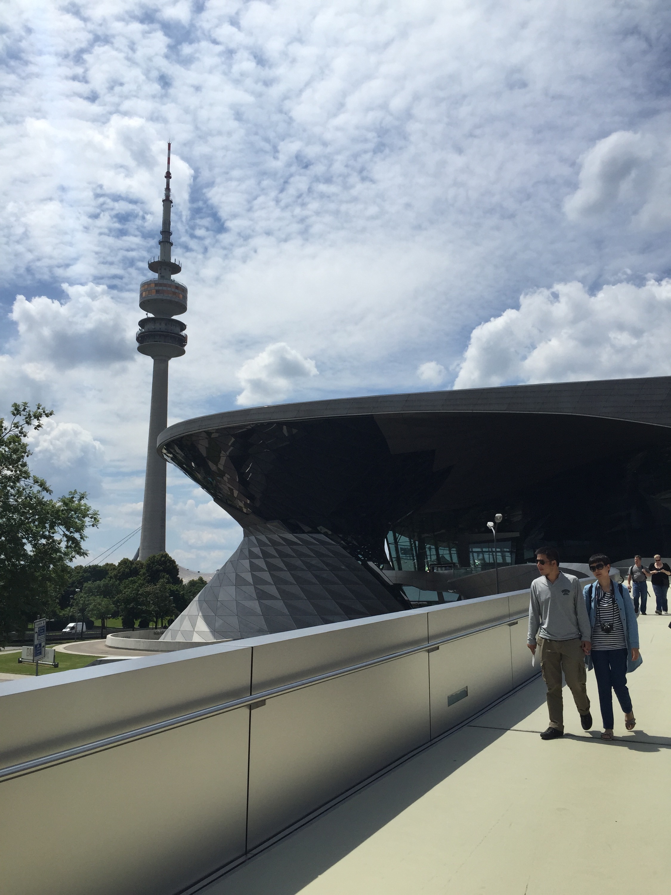 We made one more Bavarian stop in Munich on our way out of town – at the BMW Welt. You can’t very well take a mechanic to Munich and not stop there! The complex itself is gorgeous. It’s located right adjacent to the Munich Olympic park and the architectural styles are similar – ultra modern and lots of glass and metal. The entrance to the Welt is like a car showroom x 10,000 then you get to the museum. It’s a really well done timeline of BMW and its connection to and development of the auto and airplane industries. They lost me at the engine displays a few times but otherwise it was fantastic. Our mechanic was very happy!