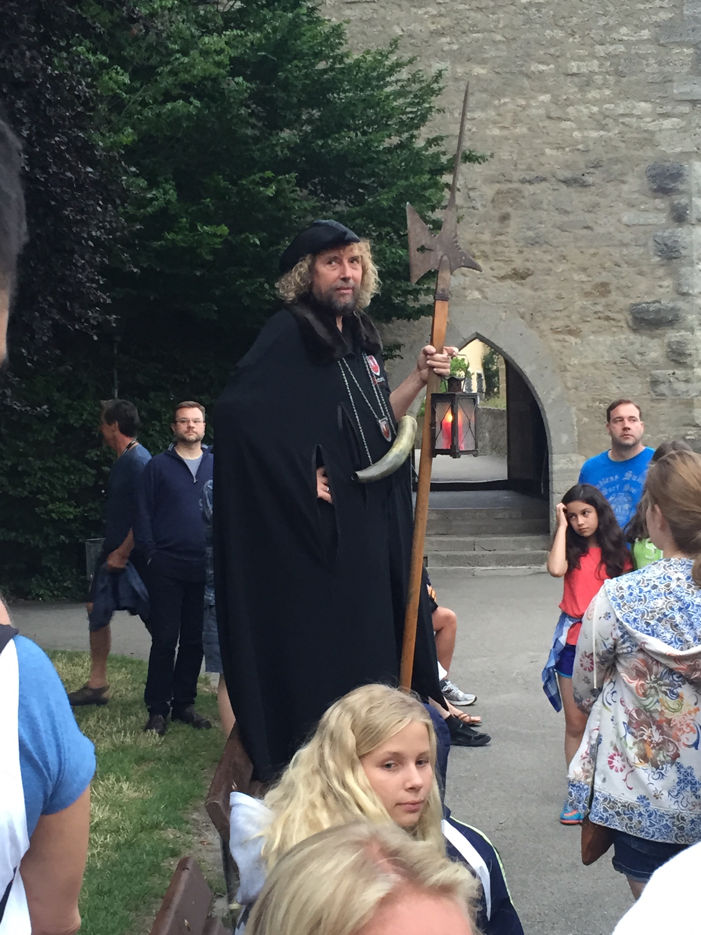 Dinner was tasty pork and spaetzle at a very cute restaurant in the village, and the night’s entertainment was Rothenburg’s most famous tourist attraction – the Night Watchman’s Tour. We got to the town square about fifteen minutes before the tour was to begin and there were people EVERYWHERE. For a tiny, sleepy town, this place was bustling. All for the tour! The Watchman showed up and the crowd gathered and we followed him through the town for an hour as he shared insight into its history – including the way an American General saved this beautiful town at the end of World War II (hint: his mom loved it!).