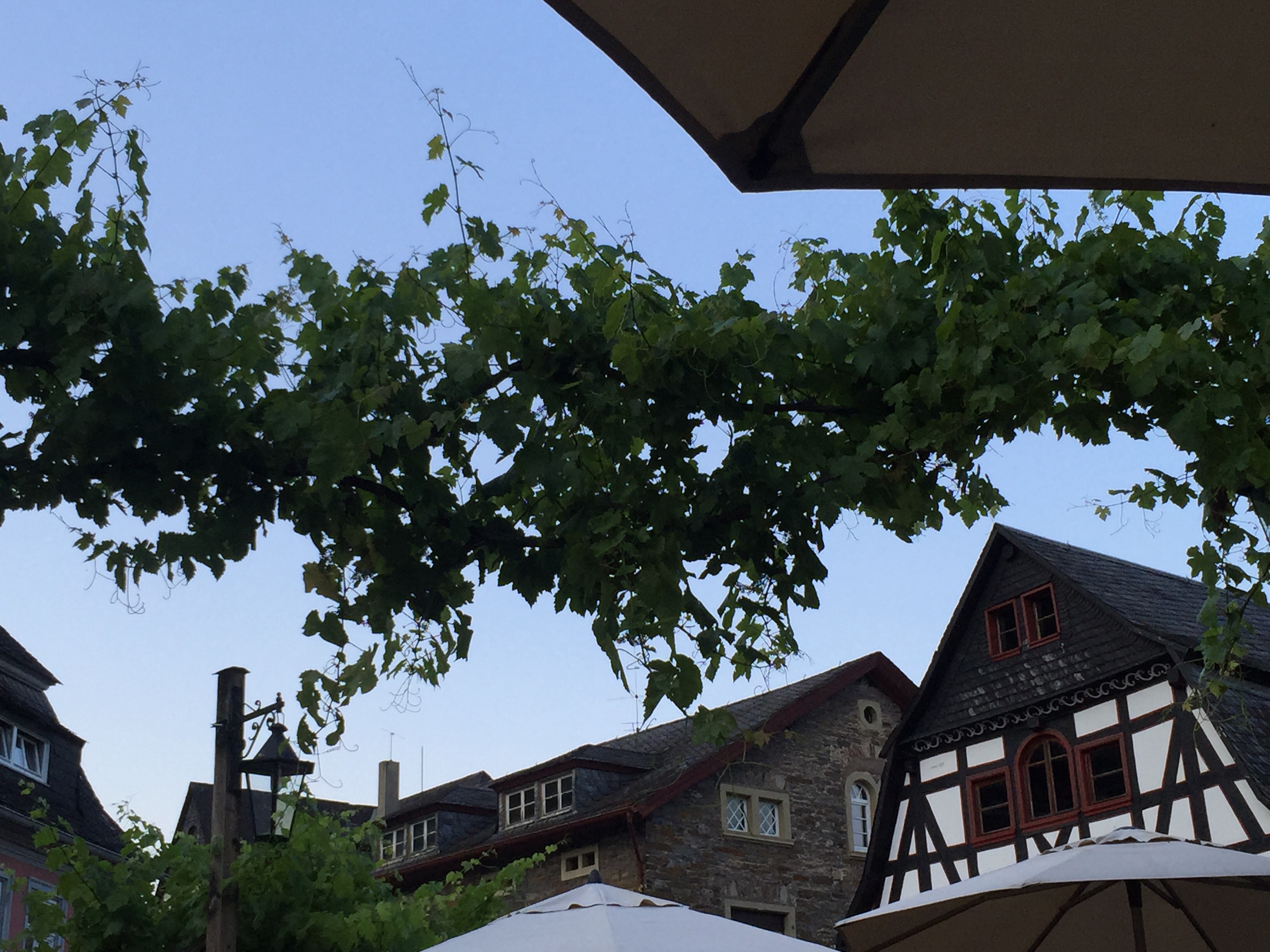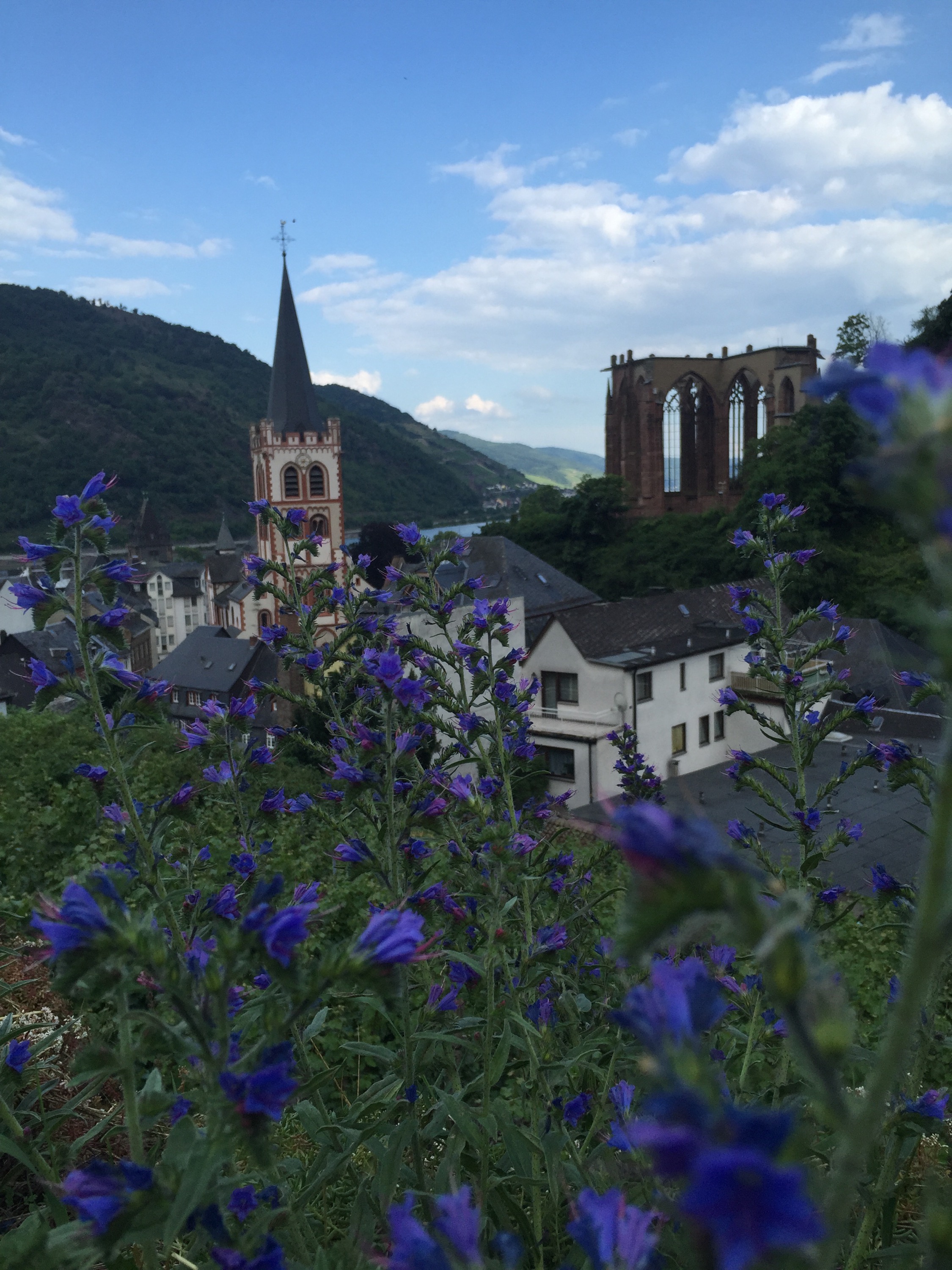 Then we got back on the road to Bacharach, a little town on the Rhine River. What a fabulous place! The town itself is reminiscent of Rothenburg in that it’s very medieval but it has its own life. First of all, we are now in wine country – Geneva on the Lake, eat your heart out! We took the Rick Steves walking tour like always and got to see a big chunk of the tiny town, complete with a hike up into the hilly vineyards for a fabulous view of the town. What a beautiful place! There are slate cliffs, vineyards creeping down the slopes, churches both in service and ruined…all beautiful and unique to the region.