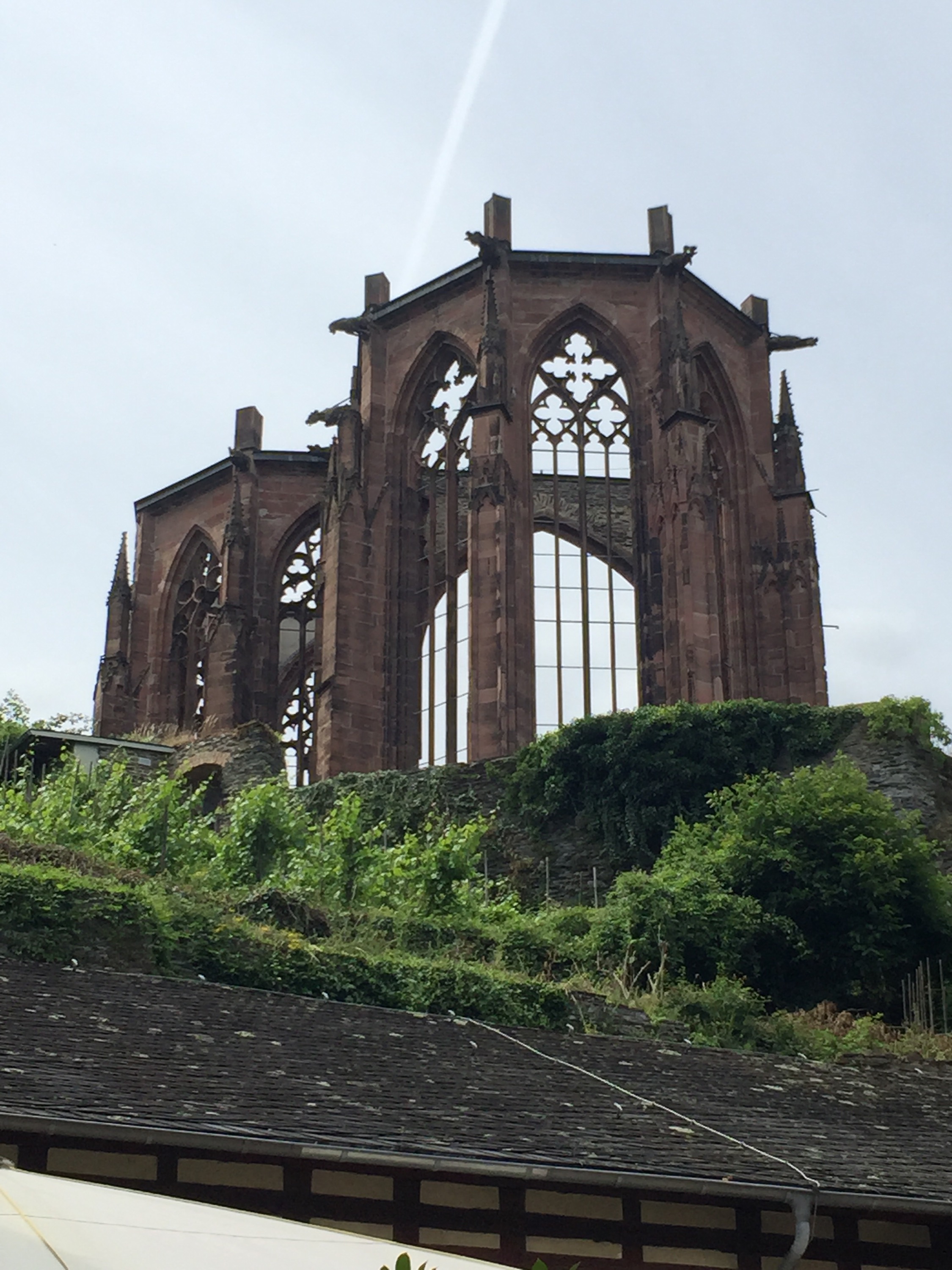 As it was Sunday, St. Goar didn’t have much going on except lots of people riding bikes everywhere. We got back to the boat after an hour of exploration and ran into Minnesota who informed us that the roads were closed…the abundance of bikes weren’t a coincidence, they were participants in an annual biking event along the Rhine – roads are closed to all cars, trucks, buses, etc. Very cool for the cyclists – crappy for our plans! We rode back to Bacharach with our Florida friends and stopped at the Post Hof Reataurant for lunch. What a great location! It’s in a courtyard at the base of the ruined chapel behind the town’s original post office. Great location, pretty good food. We had flatbreads and some traditional food (pohhhhhk!) in a beautiful location – with a ton of bikers.
