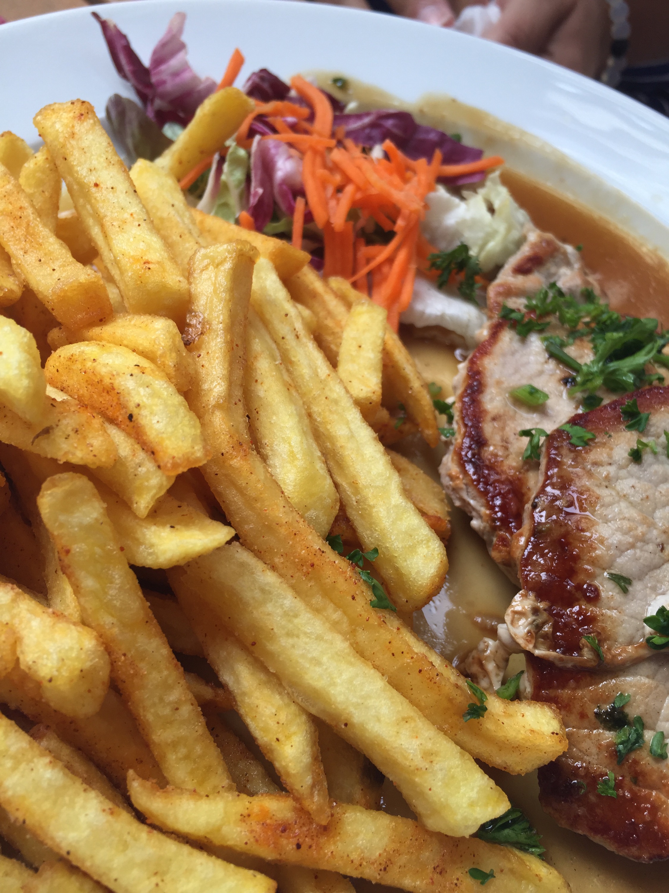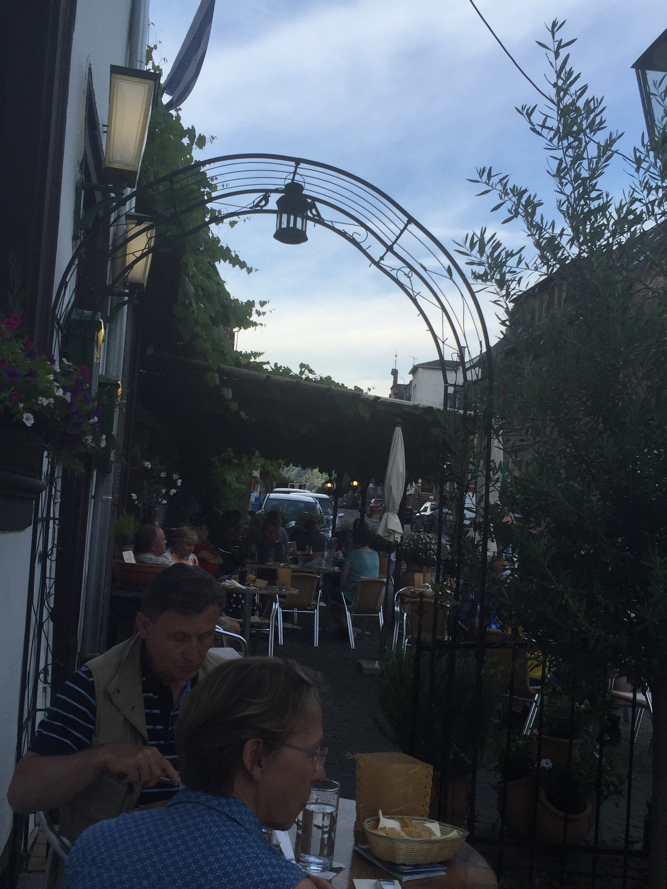 After our train ride back to Bacharach, we ran into our Floridian friends in the middle of town and they told us they were thinking of going to Zeus, the local Greek restaurant. We couldn’t decide what we wanted so that sealed the deal for us. What yummy food! I’m a sucker for Greek food anyway, but this was delicious! The company was great, the atmosphere was great – what more could you want? We enjoyed chatting with them some more before we said our good nights and made our way back to the pension for another patio night – our last of the trip. 😦